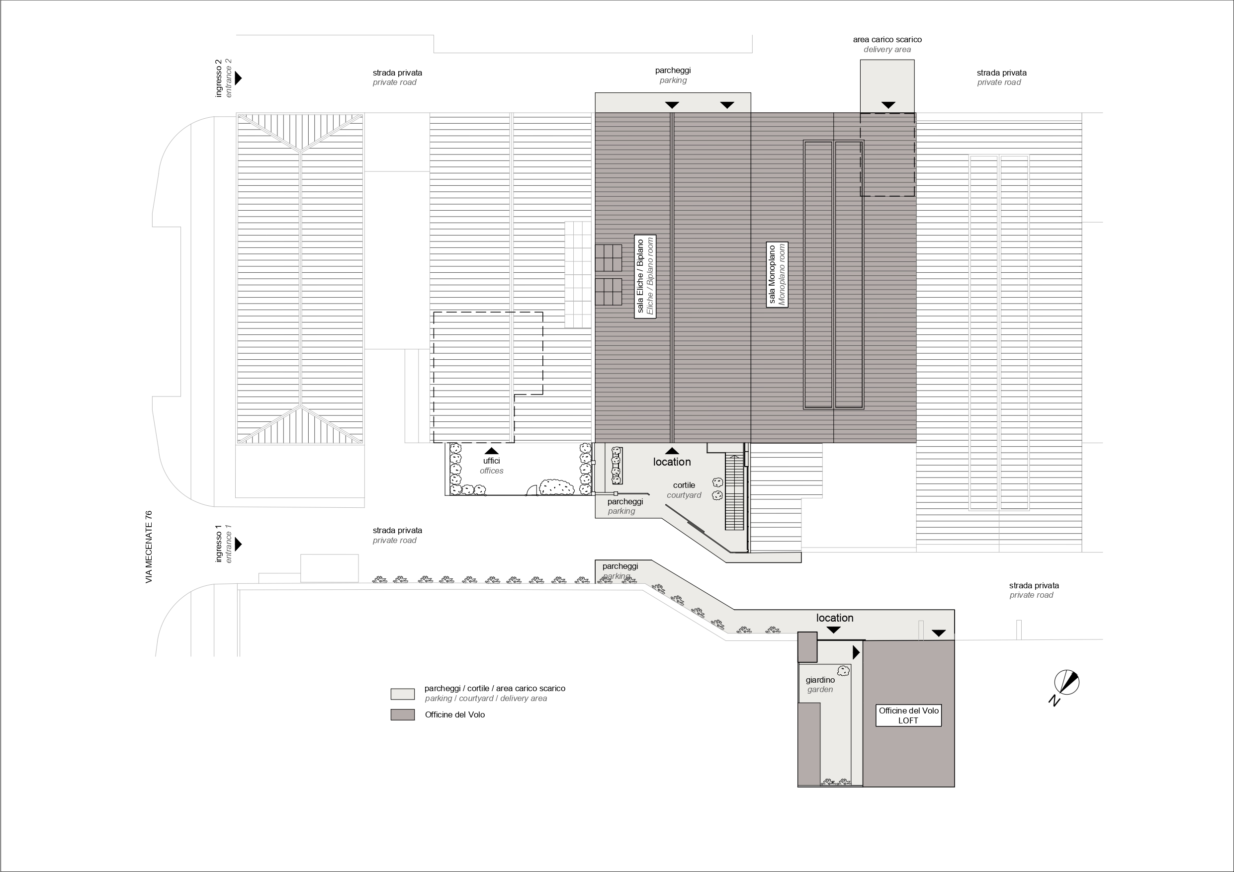 Il cortile esterno fa da ingresso alla Sala Eliche al piano terra. La facciata dell’edificio si distingue per mattoni rossi a vista e inserti in pietra grigia, materiali tipici delle industrie dei primi del Novecento. Due lesene ne esaltano il disegno, preannunciando il colonnato interno e racchiudendo il portone centrale, oltre alla finestra ad ogiva. Elementi architettonici dal carattere unico, che donano eleganza e slancio alla facciata, evidenziandone il maestoso tetto a falda. A completare la suggestione sono state conservate le ampie vetrate in ferro. La scala esterna, quasi fosse una passerella sospesa, permette l'accesso al primo piano direttamente dal cortile. Le fa da sfondo una parete in acciaio corten, in perfetta sintonia con il rosso dei mattoni. L'area è pavimentata con blocchetti in porfido, tutti originali dell’epoca.
